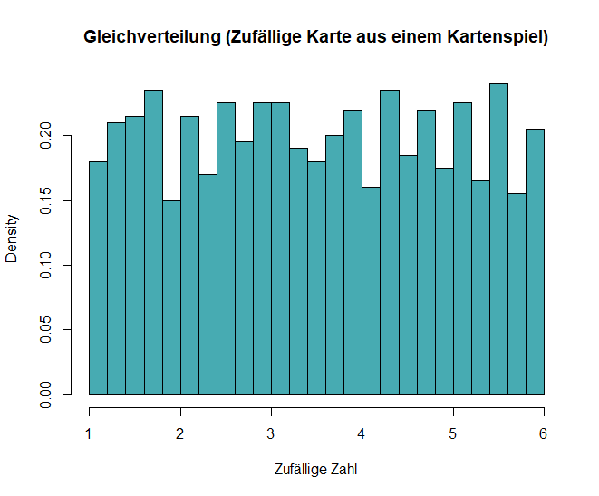 main = "Gleichverteilung (Zufällige Karte aus einem Kartenspiel)", xlab = "Zufällige Zahl", col = "#47abb2")